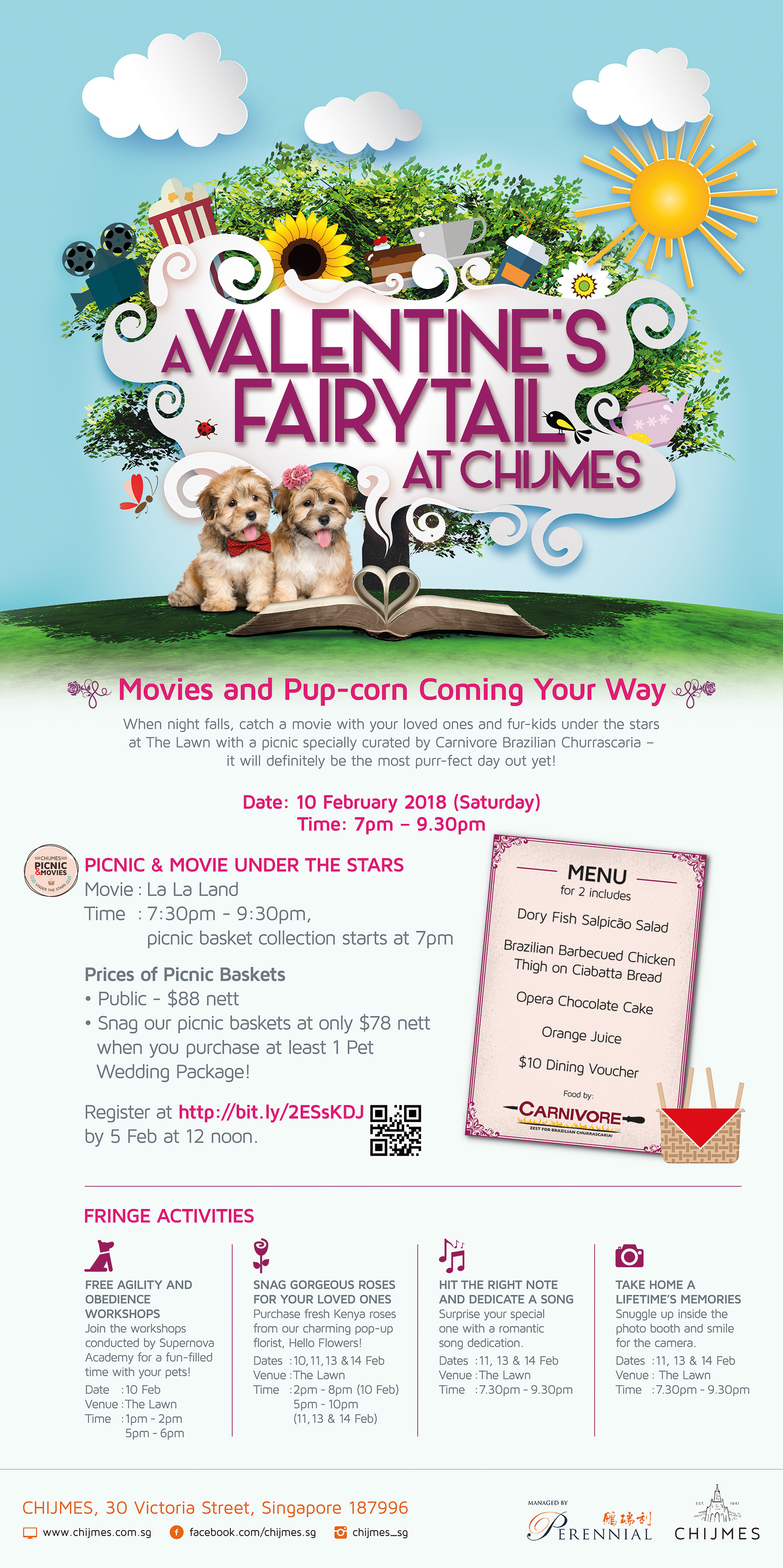 In addition to paw-fully adorable mass weddings of pets, there will be exciting agility and obedience workshops by Supernova Academy, Adopt-A-Pet drive in partnership with Animal Welfare Groups, and even pets-centric goodies, services, and activities! When night falls, catch the movie La La Land with your loved ones and fur-kids under the stars with a picnic for 2 specially curated by Carnivore Brazilian Churrascaria! For more details on A Valentine’s Fairytail, please click via the sign-up link