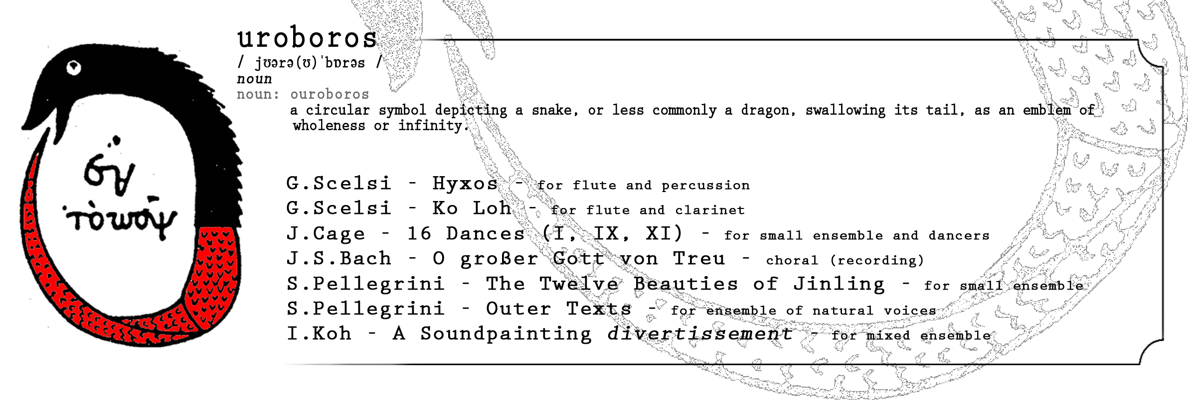 The SOTA Music Faculty is excited to present our faculty performance and first Concert for 2018, Uroboros. Come and join us for an evening of timeless music, featuring two world premieres by our faculty member Sascia Pellegrini and three John Cage’s pieces from ’16 Dances’, which involves the dancers of the SOTA Dance Faculty! Other pearls of the concert are: two pieces by the composer Giacinto Scelsi and an improvised piece with sound painting technique, conducted by another faculty member, Isaiah Koh. Last but not least, the concert also pays homage to J.S.Bach with the choral ‘O großer Gott von Treu’.